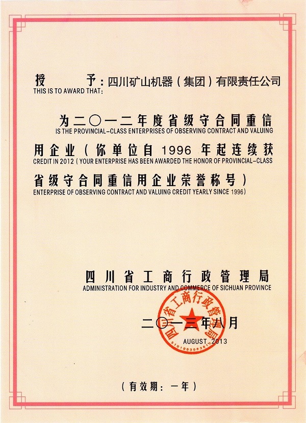 川礦集團(tuán)公司日前,從省工商局獲悉,四川礦山機(jī)器(集團(tuán))有限責(zé)任公司喜獲“省級守合同重信用企業(yè)”稱號(公司自1996年起連續(xù)獲省級守合同重信用企業(yè)榮譽(yù)稱號),并頒發(fā)了榮譽(yù)證書。