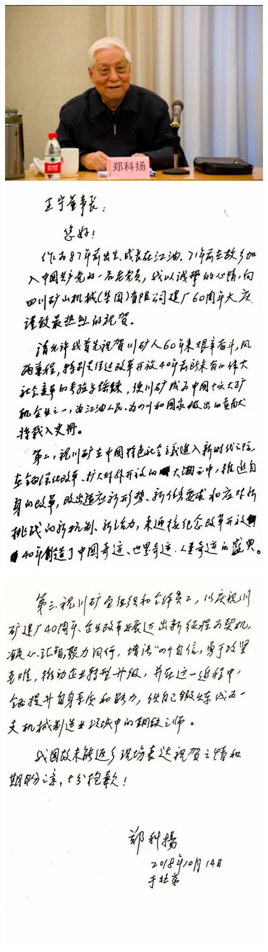 原中組部副秘書長(zhǎng)、中央政策研究室副主任鄭科揚(yáng)專門為川礦集團(tuán)六十周年華誕發(fā)來(lái)的賀信